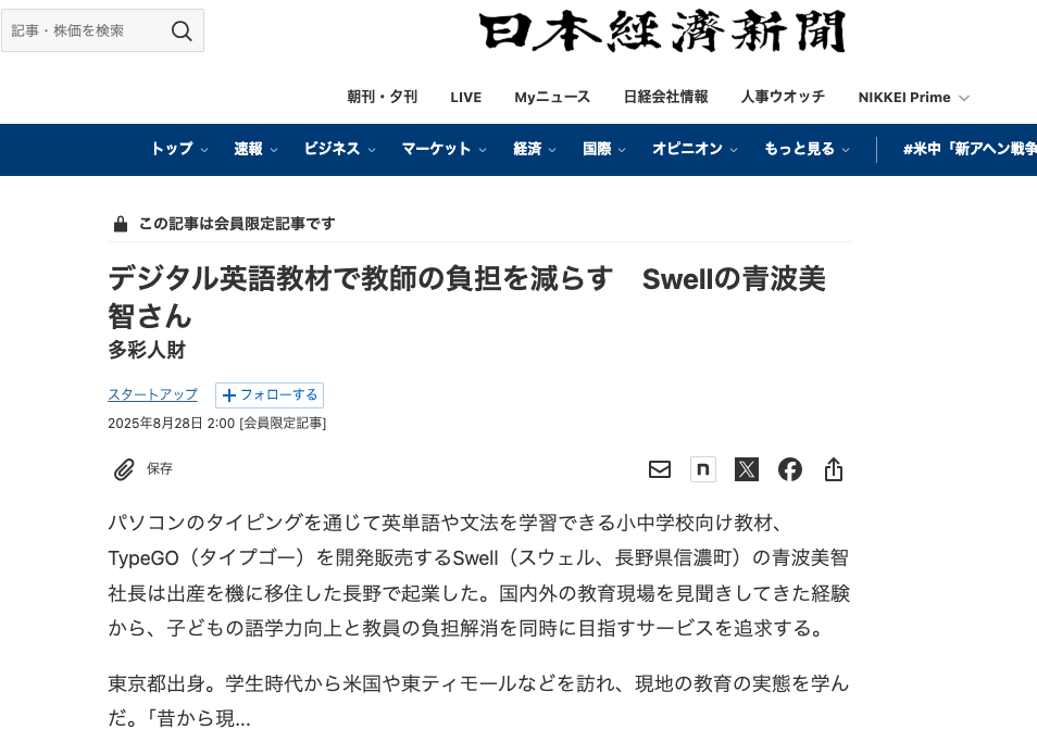 この度、弊社代表 青波が2025年8月28日付の日本経済新聞(信越版)内、「多彩人財」コーナーにて紹介されました。